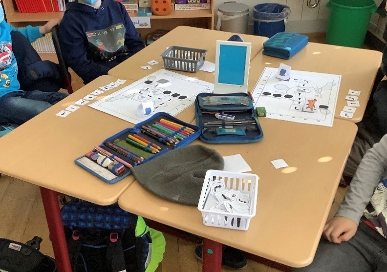 Zum Abschluss der Reihe haben wir unser Wissen mit der Hilfe von BlueBots gefestigt. Wir haben die kleinen Dinger programmiert, sodass sie Wege im Klassenraum oder auf einer Matte mit Buchstaben abfahren konnten. Wir haben viel Neues gelernt und hatten großen Spaß!