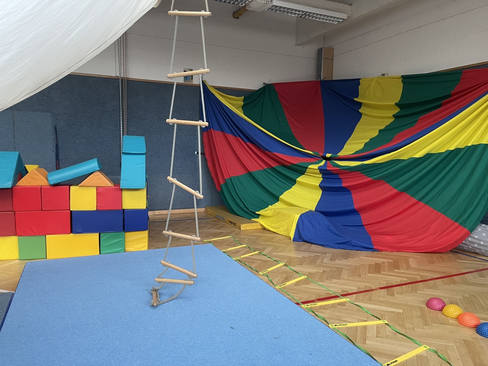 Aufgebaut waren unter anderem eine Trampolinecke, eine Strickleiter, eine Würfelstadt zum Bauen, Sandsackwerfen, eine Bärenhöhle, eine schiefe Ebene mit Sprungbrett und Kletternetz, ein Mattenberg, ein Klettertuch, eine Rollwagenbahn, ein Kreisel sowie Gummitwist.