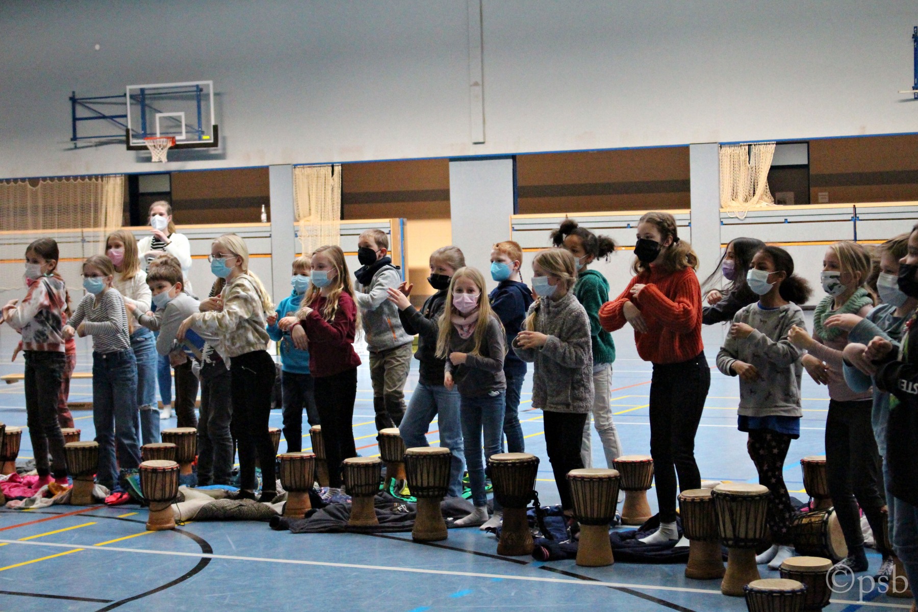 Nach Jahrgängen getrennt gingen die Schülerinnen und Schüler der Kardinal-von-Galen-Schule mit Markus Hoffmeister in der Westtorhalle auf eine Trommelreise.
