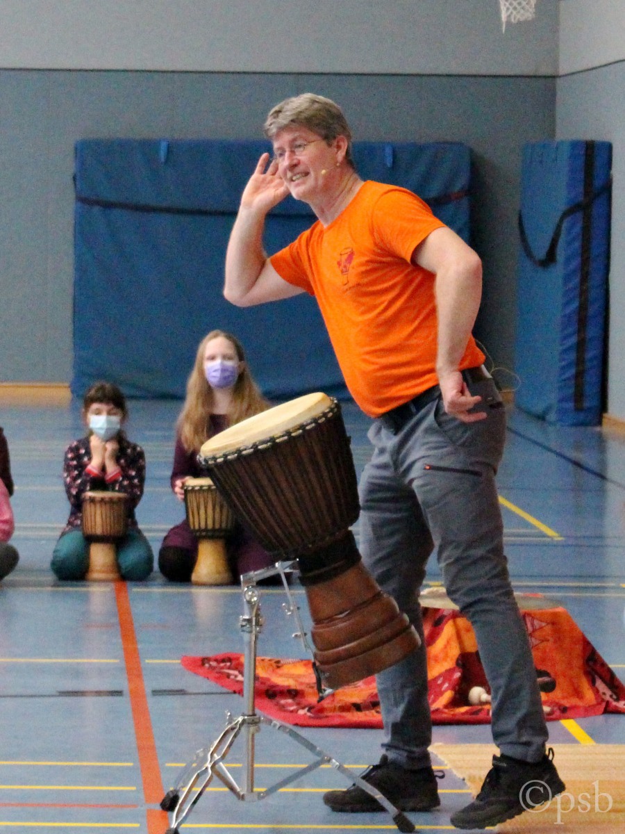 Nach Jahrgängen getrennt gingen die Schülerinnen und Schüler der Kardinal-von-Galen-Schule mit Markus Hoffmeister in der Westtorhalle auf eine Trommelreise.