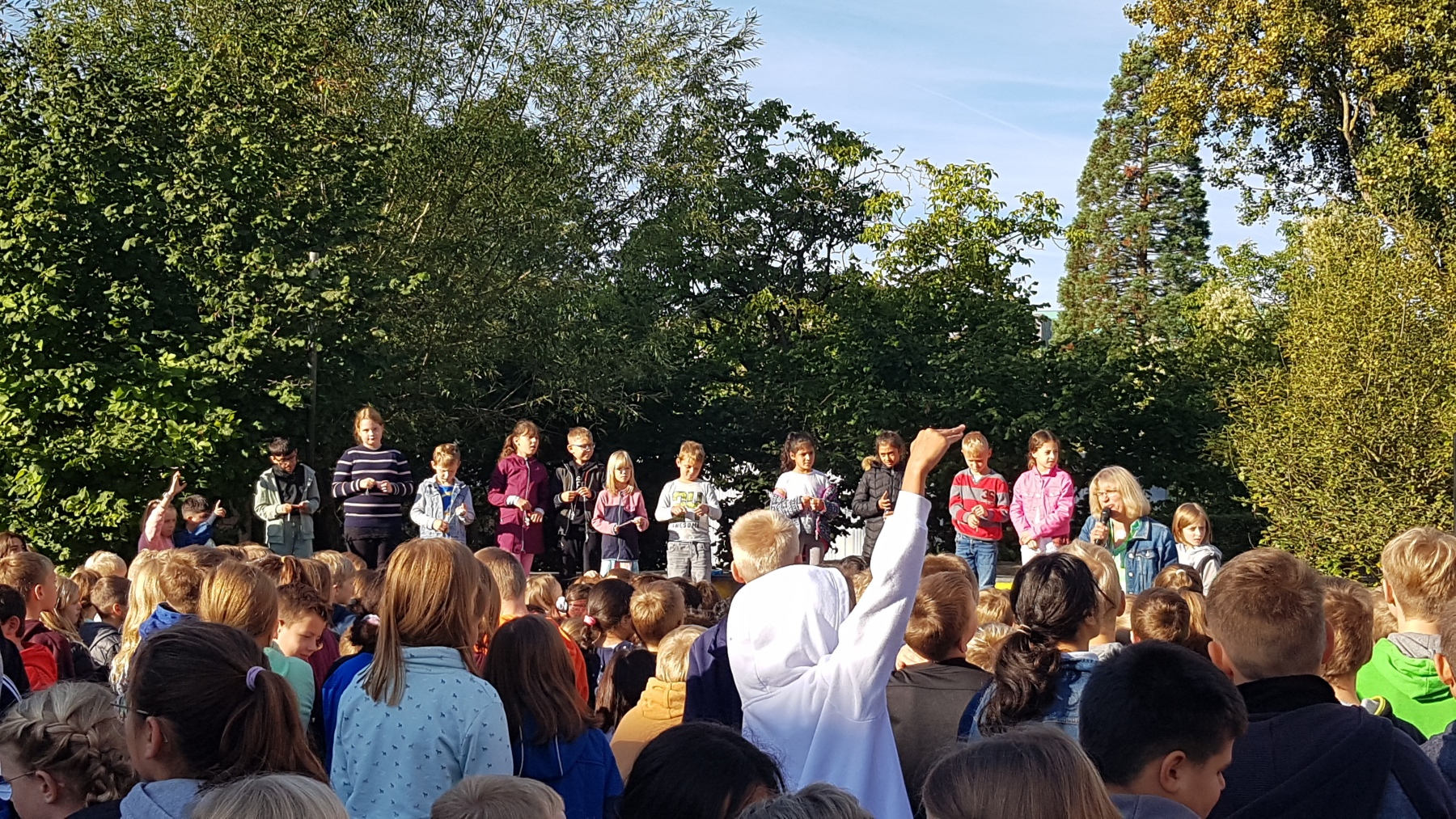 Stimmungsvoll wurden heute wieder auf dem Schulhof der KvG schon einmal die Herbstzeit eingeläutet. Um 9:15 Uhr versammelten sich alle Kinder und Lehrkräfte zum gemeinsamen Singen auf dem Schulhof. Mit viel Spaß wurden alte, bekannte und extra neu eingeübte Lieder gesungen. Nicht nur der Schulchor unter der Leitung von Frau Rathmer Schumacher präsentierte seine Lieder, auch einige Klassen trugen zu dem bunten Programm zum Thema Herbst bei. Vielen Dank an das Vorbereitungsteam für die gelungene Veranstaltung.