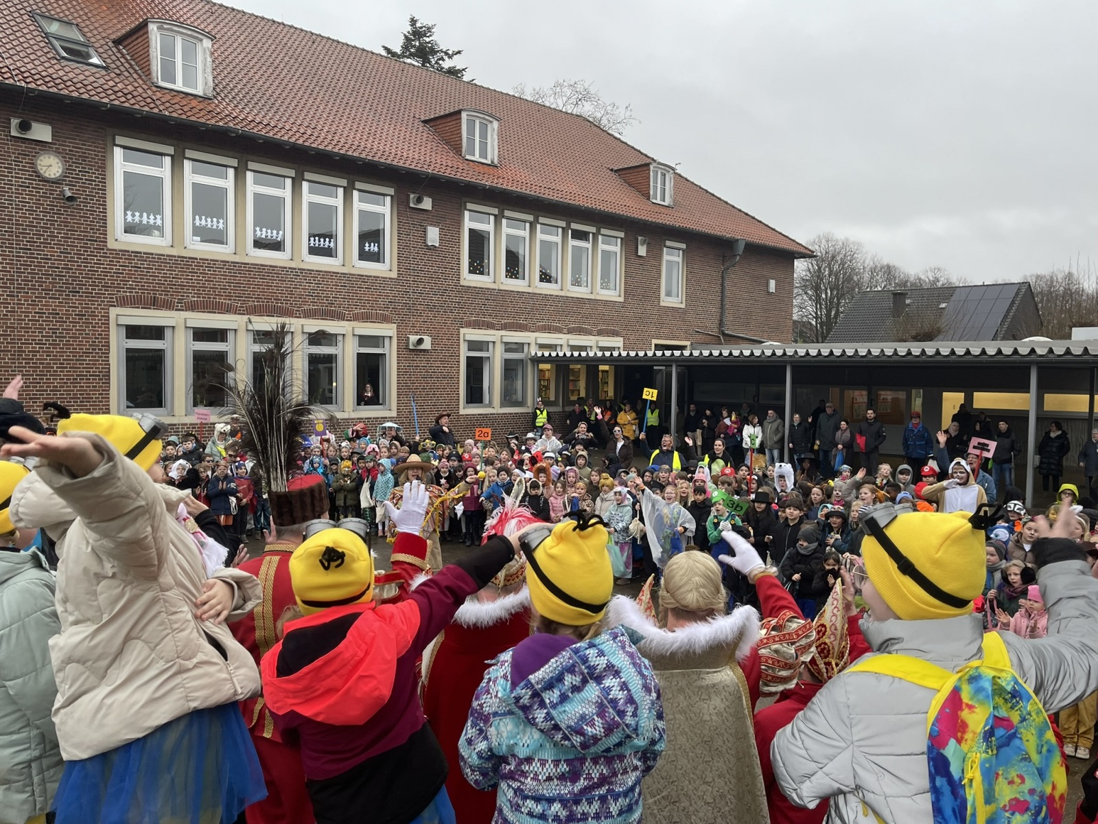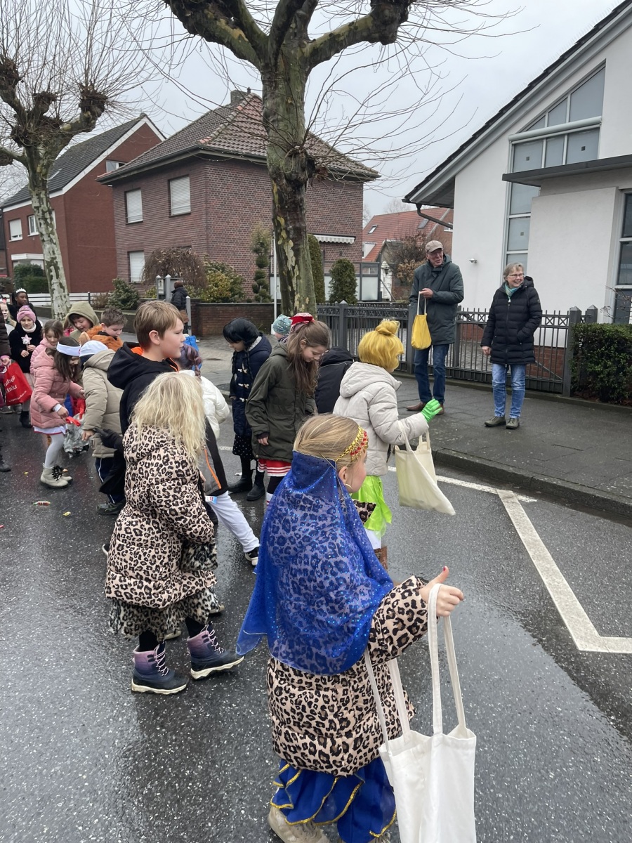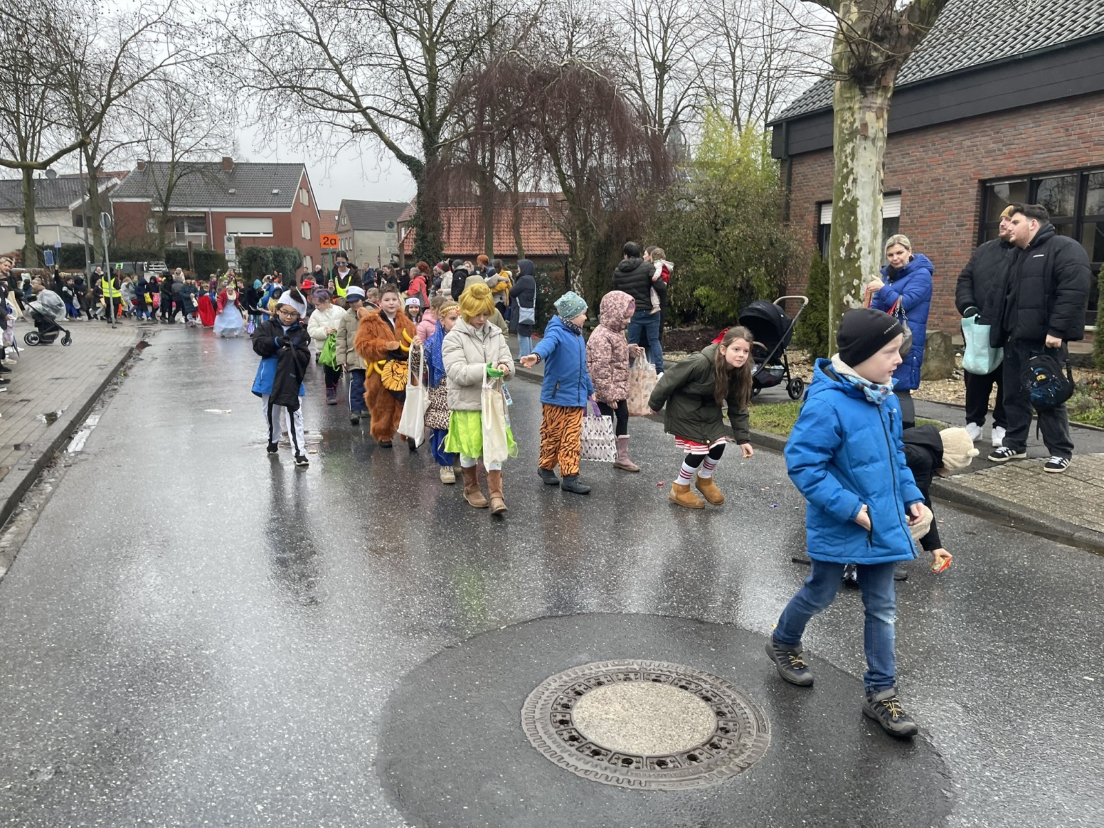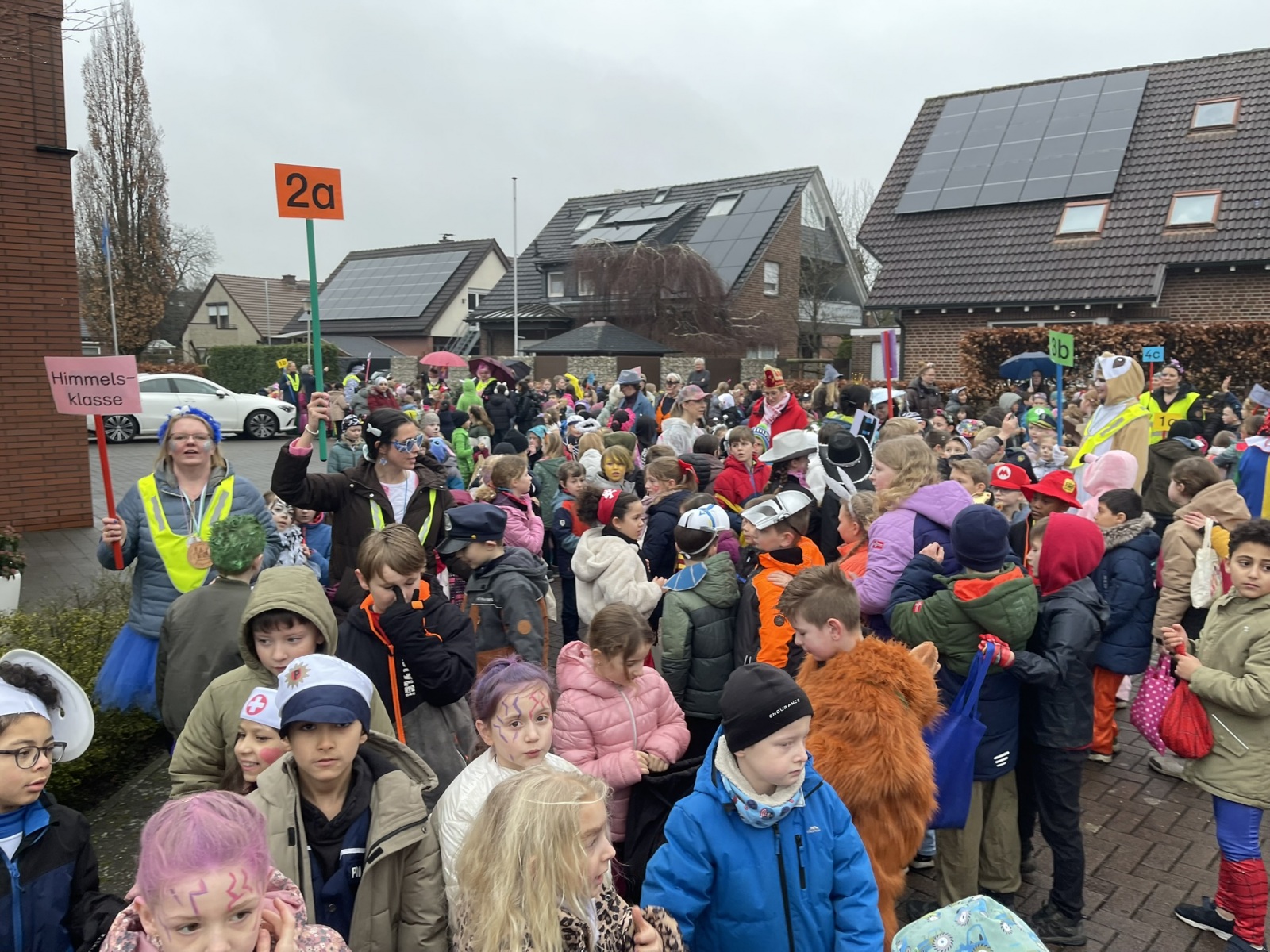 Zahlreiche Eltern, Großeltern sowie Anwohnerinnen und Anwohner säumten die Straßen, winkten begeistert und ließen die Kamelle regnen. Mit prall gefüllten Jackentaschen und strahlenden Gesichtern kehrten die Kinder schließlich auf den Schulhof zurück, wo das Prinzentrium und das Gefolge noch einmal lautstark verabschiedet wurden.