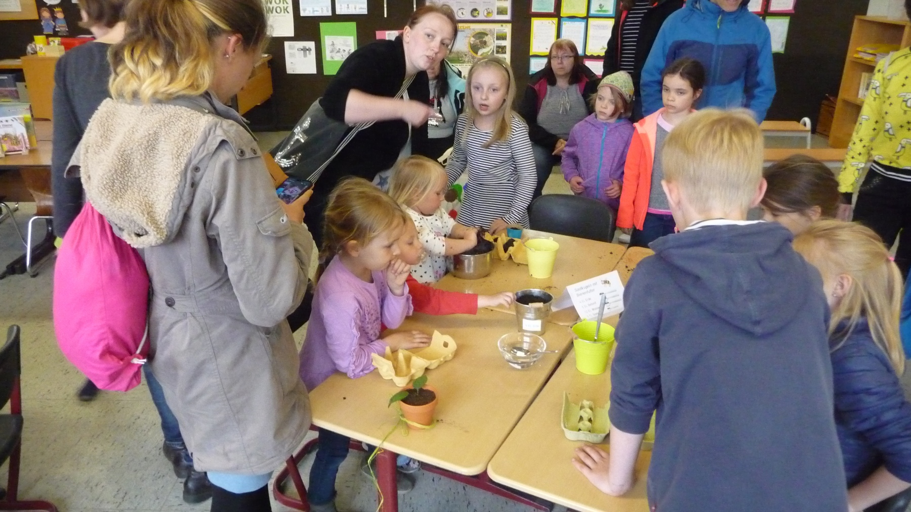 Aufgrund des unbeständigen Wetters wurden allerdings alle Aktionen in die Schulgebäude verlegt, dies tat der Stimmung jedoch keinen Abbruch. Im Gegenteil, pünktlich zum Start um 15 Uhr, schaute die Sonne hervor und die Erstklässler konnten das Publikum mit dem Lied “Wir sind Kinder unserer Erde” einstimmen und die Schulleiterin Christel Hille freute sich über so viele Gäste.